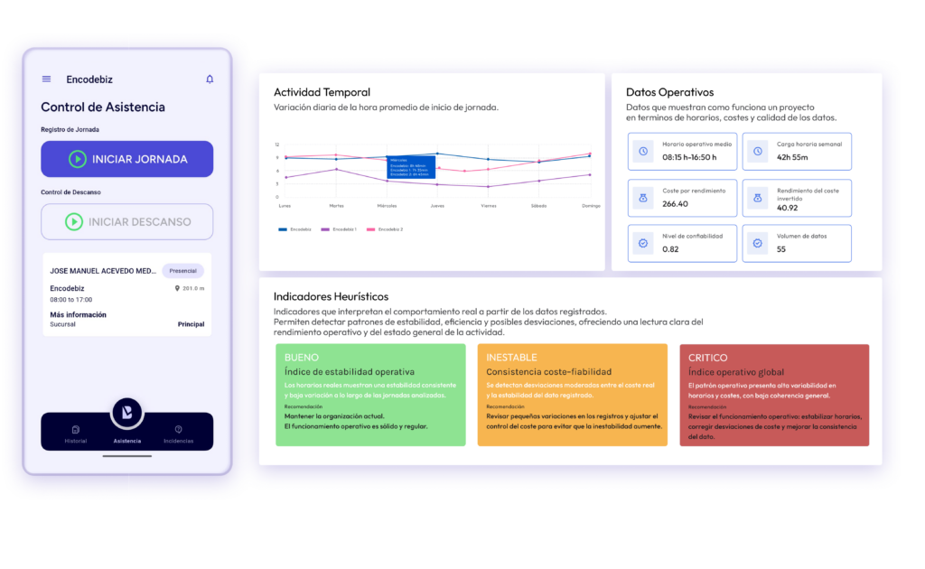 La plataforma mide si el funcionamiento global de una sucursal/proyecto es estable o presenta señales de riesgo operativo: alta variabilidad, fallos recurrentes, horarios incoherentes, etc.